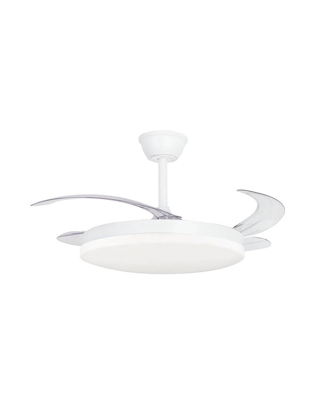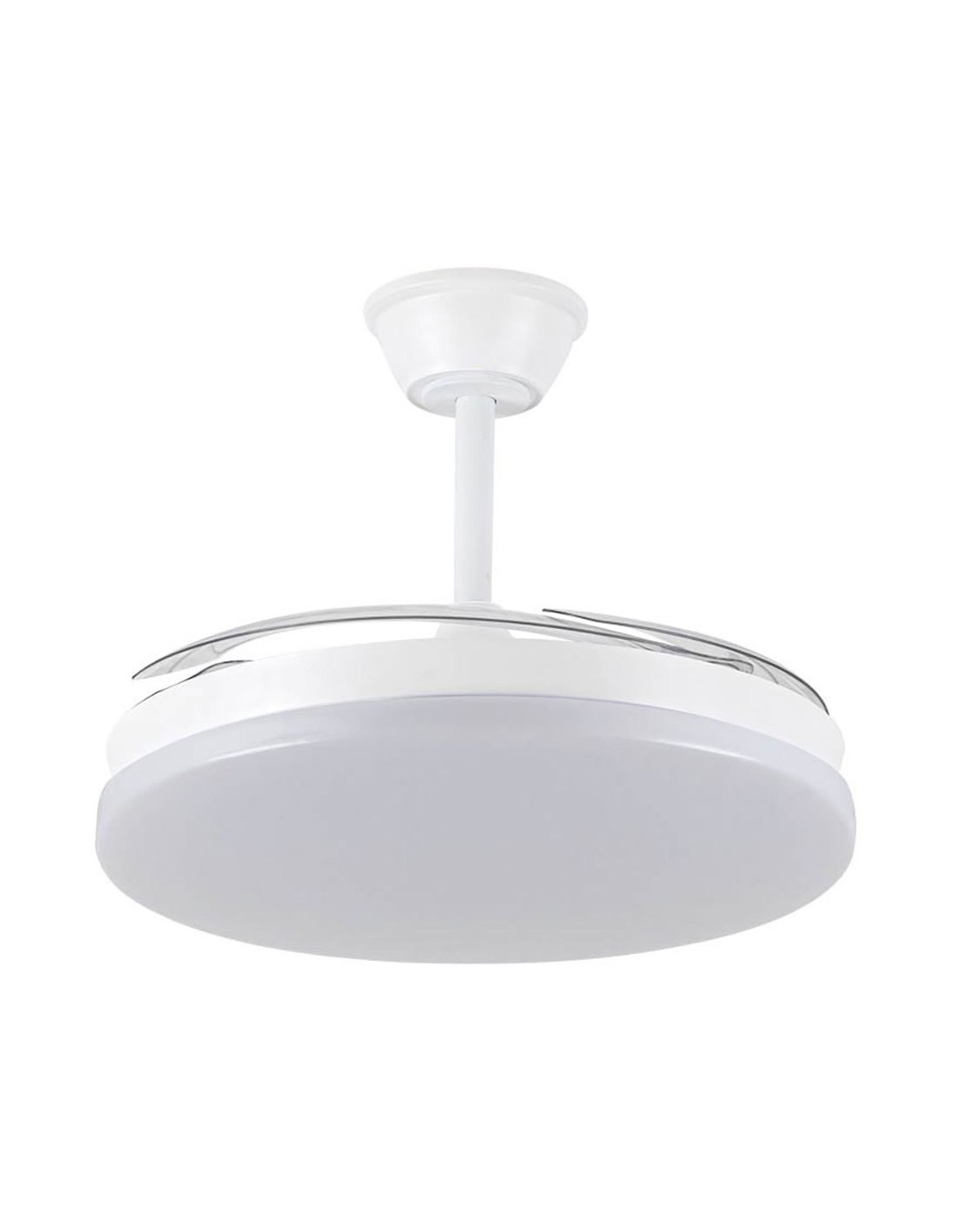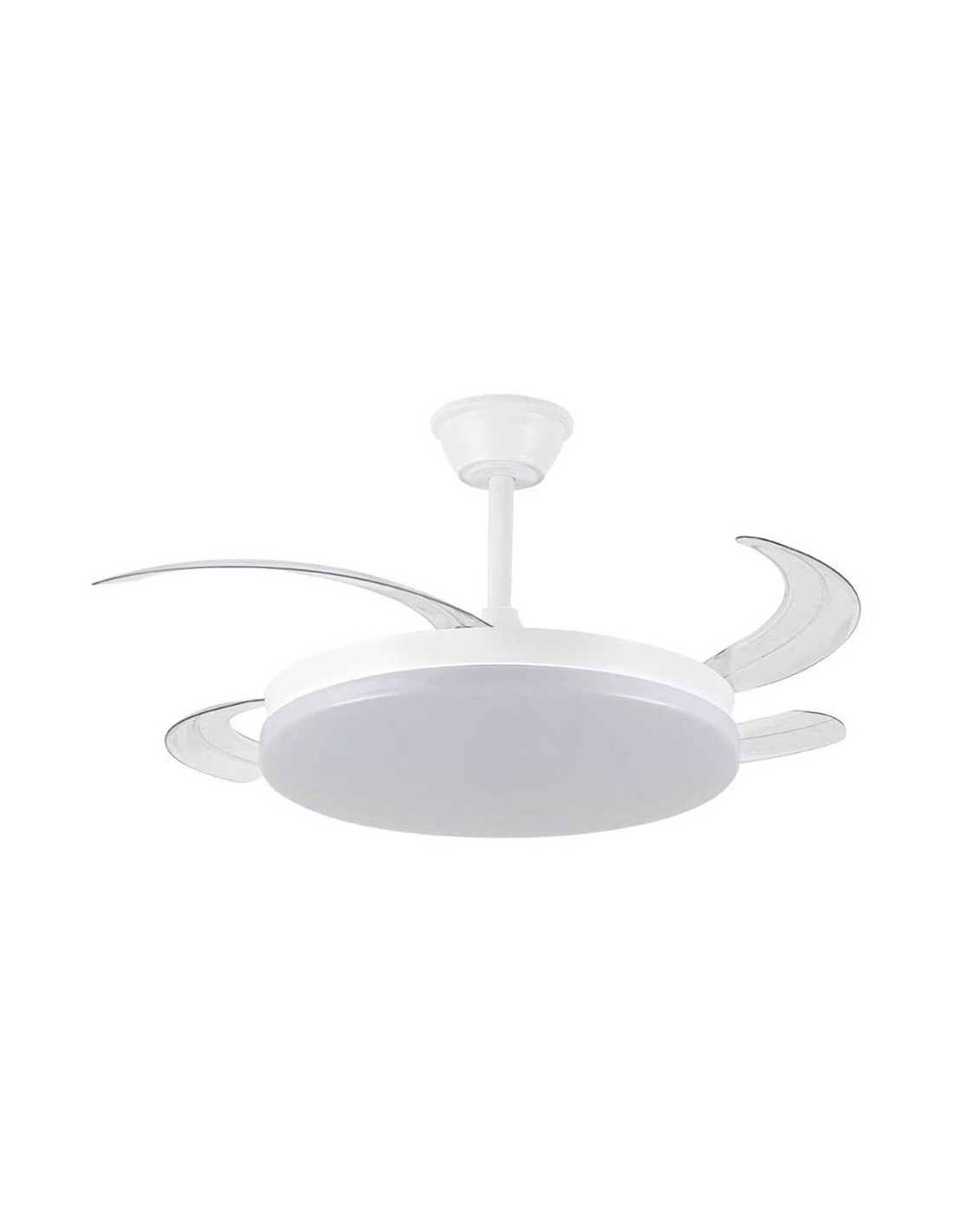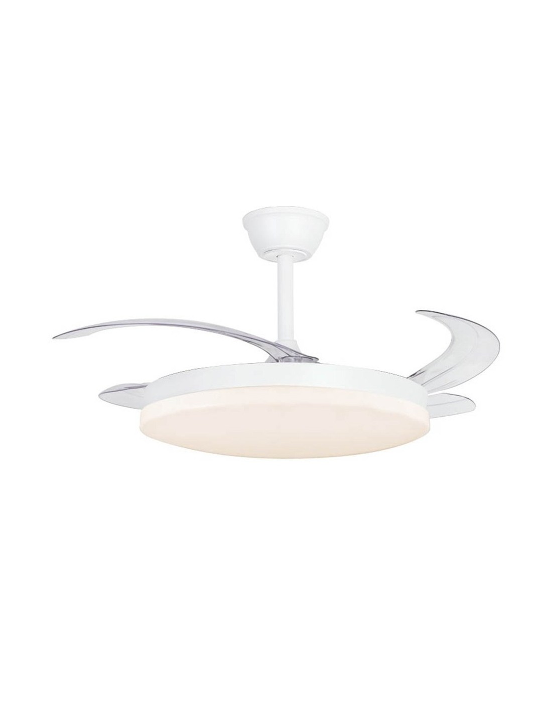 Ventilador de techo blanco, modelo milky l evo smart, silencioso, sonido 31-39 db hecho de acero 4 aspas retráctiles de policarbonato difusor de metacrilato opal 6 velocidades motor dc 10,5 - 29 w led 72 w 7920 lm, tres tonos de luz con intensidad regulable 3000-4000-6000 k rpm 162-225 función brisa, inversa y luz noche temporizador 1-2-4 h memoria de encendido cct flujo aire: 3950-6150 m³/h clase protección i clase energética g ip20 cri 80 vida útil: 20.000 h, 220-240 v~ 50 hz, para habitación 20m² techo inclinado hasta 18° con mando a distancia y soporte de pared para mando incluidos, pilas 2 x aaa no incluidas. smart app. dimensiones: con aspas ø120 cm, plafón ø48 cm, altura 32 - 42 cm