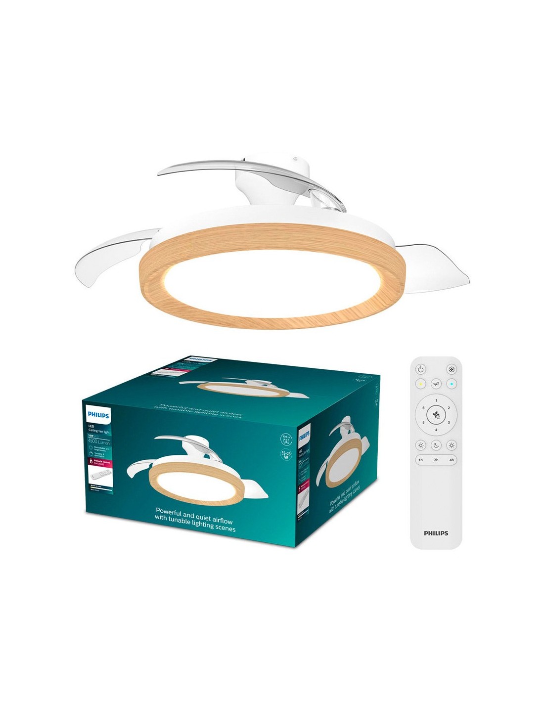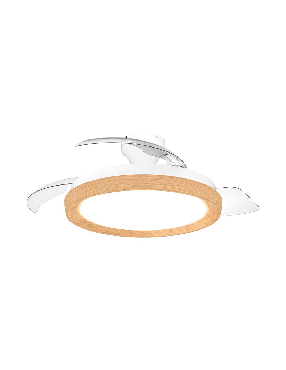 Ventilador de techo led 3cct, color blanco y dorado, modelo bliss, con aspas retráctiles transparentes, 35 w, 4500 lm, tipo de flujo luminoso 360°. tres tonos de luz: 2700 k- 4000 k - 6500 k, con intensidad regulable. luz nocturna. vida útil nominal: 15.000 h. flujo de aire natural + 6 velocidades, función inversa invierno-verano, motor ultrasilencioso dc 28 w. función de temporizador: 1 / 2 / 4 h. tensión: 220-240 ca, ip20. con mando a distancia (pilas no incluidas). incluye elementos de fijación. dimensiones con aspas: ø106 x 29 cm, plafón ø51 cm
